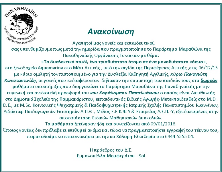 ΑΝΑΚΟΙΝΩΣΗ 09/01/2016 Pin It Previous Post Λύρειο Ίδρυμα In Κοινωνική Δράση Λύρειο Ίδρυμα View Post Next Post ΠΑΡΑΡΤΗΜΑ ΜΑΡΑΘΩΝΑ - ΑΝΑΔΙΑΤΑΞΗ ΜΕΛΩΝ… In Uncategorized ΠΑΡΑΡΤΗΜΑ ΜΑΡΑΘΩΝΑ - ΑΝΑΔΙΑΤΑΞΗ ΜΕΛΩΝ ΔΙΟΙΚΗΤΙΚΟΥ ΣΥΜΒΟΥΛΙΟΥ View Post