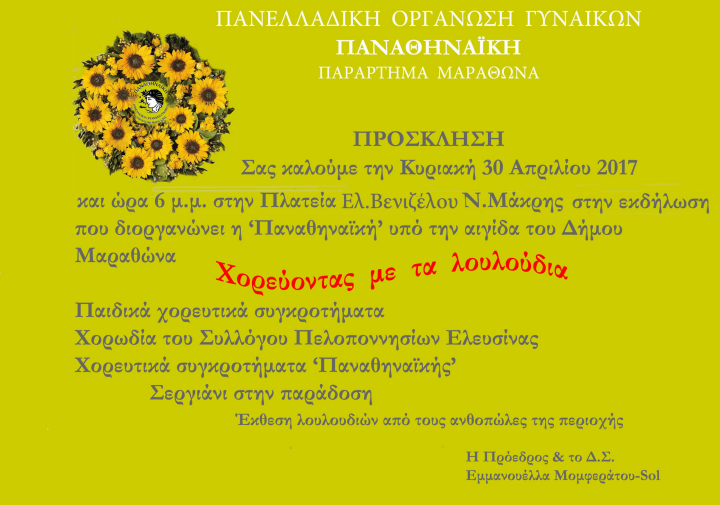 Καταρχήν σας ευχαριστούμε για την ομόφωνη απόφαση, με αριθμό 17/17 του Δημοτικού Συμβουλίου, με την οποία εγκρίνατε την παρουσίαση των χορευτικών ομάδων του Παραρτήματός μας στις εορταστικές εκδηλώσεις της πρωτομαγιάς.