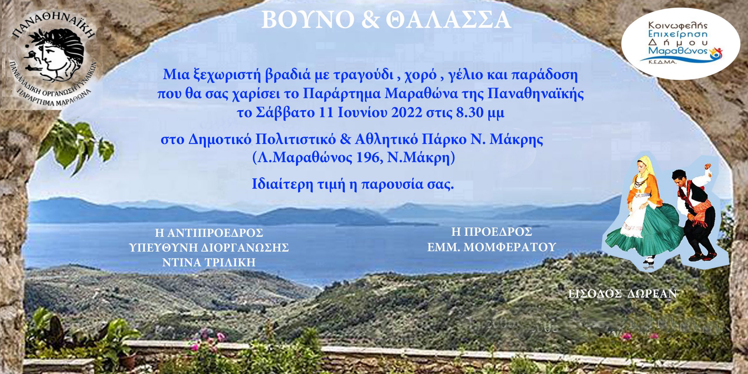 Η ΠΑΝΑΘΗΝΑΙΚΗ ΜΑΡΑΘΩΝΑ σας καλεί όλες και όλους να περάσουμε μια ιδιαίτερη βραδιά με κέφι , γέλιο και ζωντάνια το ΣΑΒΒΑΤΟ 11 ΙΟΥΝΙΟΥ και ώρα 8.30 μ.μ. στο Αθλητικό και Πολιτιστικό Κέντρο Ν. Μάκρης .