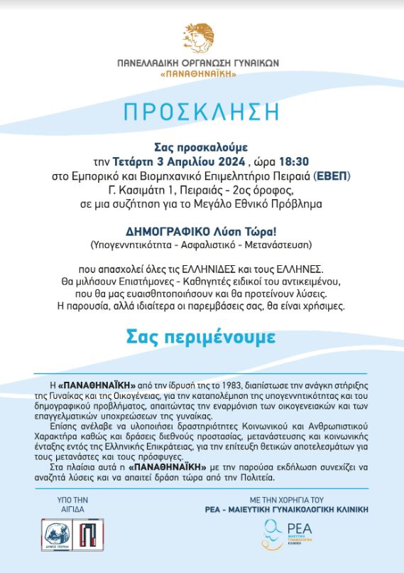 – «ΔΗΜΟΓΡΑΦΙΚΟ – Λύση Τώρα», Τετάρτη 3 Απριλίου, ώρα 18.30, Εμπορικό & Βιομηχανικό Επιμελητήριο Πειραιά, Γ. Κασιμάτη 1, Πειραιά, (1ος όροφος)
