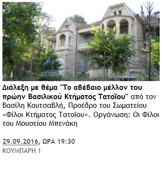 ΔΙΑΛΕΞΗ ΜΕ ΘΕΜΑ “ΤΟ ΑΒΕΒΑΙΟ ΜΕΛΛΟΝ ΤΟΥ ΠΡΩΗΝ ΒΑΣΙΛΙΚΟΥ ΚΤΗΜΑΤΟΣ ΤΑΤΟΪΟΥ” ΑΠΟ ΤΟΝ ΒΑΣΙΛΗ ΚΟΥΤΣΑΒΛΗ 11/09/2016 Pin It Previous Post ΚΩΝΣΤΑΝΤΙΝΟΣ ΠΙΤΤΑΣ ΕΙΚΟΝΕΣ ΜΙΑΣ… In Αξίζει να δείτε ΚΩΝΣΤΑΝΤΙΝΟΣ ΠΙΤΤΑΣ ΕΙΚΟΝΕΣ ΜΙΑΣ ΑΛΛΗΣ ΕΥΡΩΠΗΣ 1985-1989 View Post Next Post ΕΠΙΣΚΕΦΘΕΙΤΕ ΤΟ ΣΠΙΤΙ ΤΟΥ PATRICK… In Αξίζει να δείτε ΕΠΙΣΚΕΦΘΕΙΤΕ ΤΟ ΣΠΙΤΙ ΤΟΥ PATRICK ΚΑΙ ΤΗΣ JOAN LEIGH FERMOR View Post